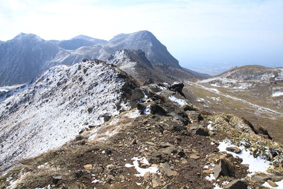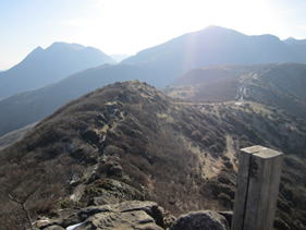 天狗ヶ城山頂より中岳を望む。歩いてきた尾根がはっきりと見える。