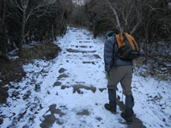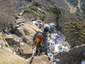 沓掛の尾根を進む 7時57分 鉄製のはしごを下る。滑らないよう慎重に。 |
