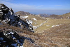 星生山山頂から、これから進む星生崎を望む。尾根が岩、岩、岩で歩き辛そうだ。