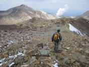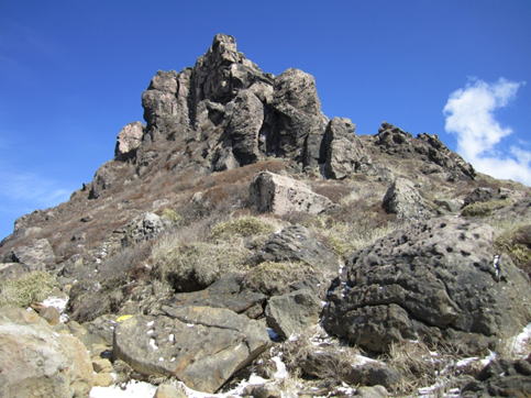 凛々しい姿の星生崎。 星生崎下のガレ場から大岩を見上げる。