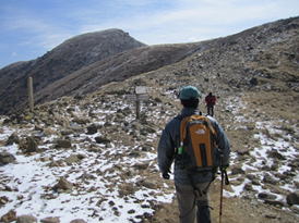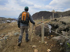 展望台を通過 14時34分 展望台からのコンクリの下山道は、ところどころ雪が残っていて非常に歩き難かった。 |