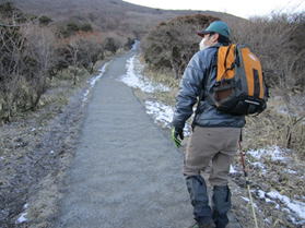 1、牧ノ戸登山口を出発 7時17分 両サイドに少し雪が残るコンクリートの登山道・・・ |