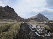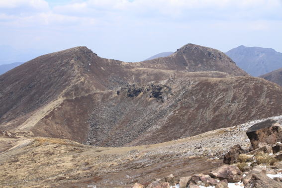 左)天狗ヶ城、右)中岳の双耳峰。ここからは見えないが、中央鞍部の下に火口湖御池がある。