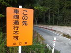 道路を外れて右へ 7時52分 クマに注意の看板からすぐ近くに、車中から見た 「この先車両通行不可」 の黄色い看板があった。 その少し先から道路を外れて右へ。 溜池から下ってきた |