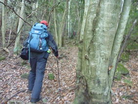 森らしくなってきた 8時42分 落葉のカーペットを踏みしめ気分がいい。 一歩一歩、ピンクのテープを辿り上って行く。 ヨイショっと! |