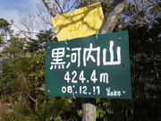 3、黒河内山山頂 10時01分 424m 視界が一気に広がり、眩しい光に包まれる。 山頂はあまり広くない。小休止。 くろこうじやま |