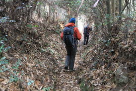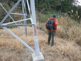 鉄塔から鉄塔巡視路を下る 14時29分 ここから車を停めている明神溜池を目指すが、まずは117番鉄塔が目標となる。左の写真の場所は鉄塔のすぐ近く。狐ヶ峰からは右手の道を下って来た。 下り着いたところに右に折り返すような坂道がある。 落ち葉で少々隠れているが、プラスチックの階段になっている。 このプラスチックの階段が中国電力の鉄塔巡視路である。ここから長い階段を下って行く。 |