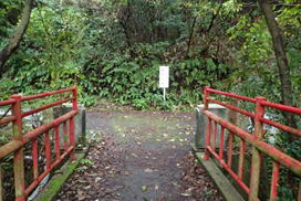 ます渕橋にさしかかる 8時36分 落ち葉が彩る遊歩道を歩いて行くと、すぐに赤い 「ます渕橋」が現れる。渡ることにする。 ![]() |