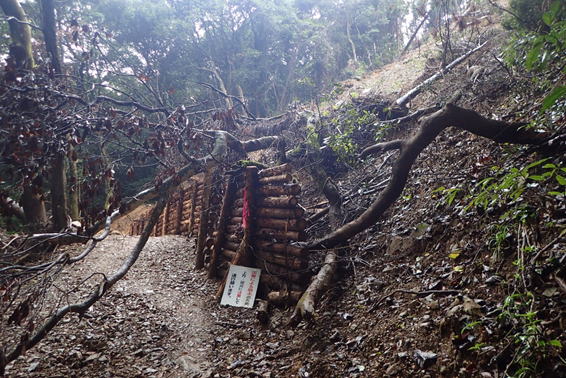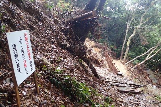 下山時にまた崖崩れ跡を通過 9時45分 土が雨に濡れて滑る |