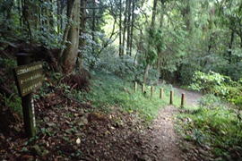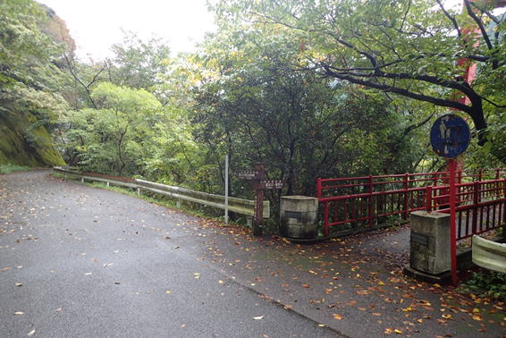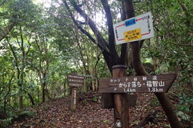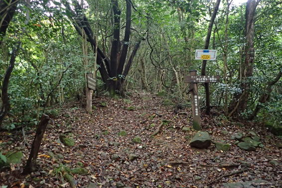 | ここは九州自然歩道のルートとホッテ谷新道との分岐になる。さあどっちに進もうか?と悩んでいたところに、大粒の雨が降ってきた。傘を差して5分程休憩したが状況は変わらない。 |