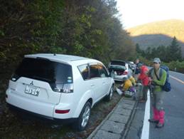 大曲りから駐車した路肩へ 14時59分 朝は車が連なっていたが、ほとんど車がいなくなっていた。皆さん下山が早いようだ。