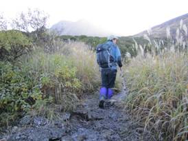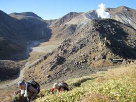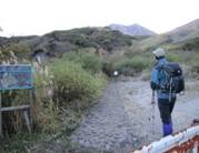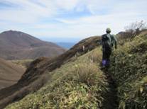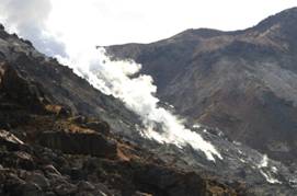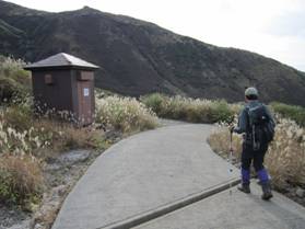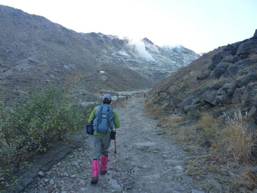 正面に硫黄山を見て進む。噴煙が上がり、鉛色の山肌が硫黄で部分的に黄色くなっている。