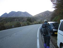 これから登る三俣山を望む 登山口に到着。入念に点検したザックだが、忘れ物をした。車まで取りに戻ってタイムロス。