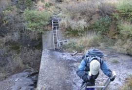 小鍋の縁、両手を付きながら下る 11時09分 色付いた木々に秋を感じながら進む。
