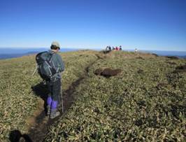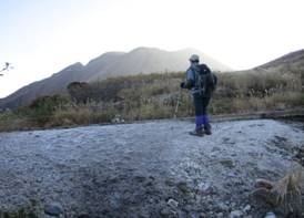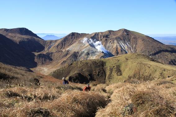 下を振り返ると・・・ 8時34分 上って行くにつれ、下界の景色が広がっていく。すがもり越が小さくなって、久住山のてっぺんも見えだした。 硫黄山の噴煙もまっすぐに立ち昇り、風のないことがよく分かる。 下から、私たちより年輩のご夫婦がドンドン近づいてきた。と思ったら、あっさり抜かれてしまった。悔しいがしかたない。(涙) |