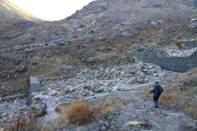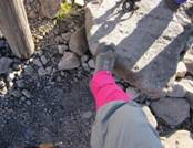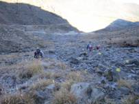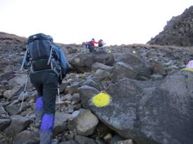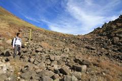 ガレ場は足元に気を付けて 8時06分 黄色のペンキを目印に足場を確認して歩く。