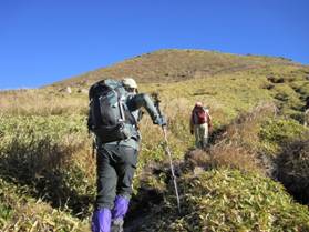 南峰を見上げる 11時29分 平治岳(大戸越)も真正面にくっきりと見える。