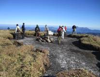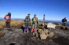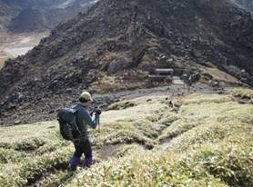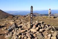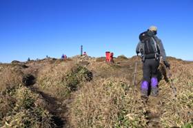 西峰山頂から真下を見ると、すがもり越が小さく見える。すがもり越からここまで25分で歩いてきた。硫黄山の噴煙の後ろは星生山、その左手は久住分れと久住山。この景色は何度見ても圧巻である。 山頂では多くの登山者が、いろんな山を見つけながら景色を楽しんでいた。 |