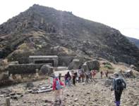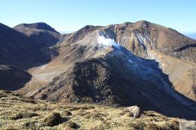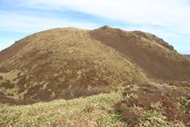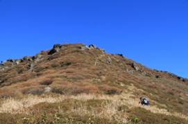| 北峰をズームして撮影。 尾根の右下にちょこんと突き出た岩が、先ほど登って記念撮影した岩である。 左上の北峰山頂には登山者が確認できる。この急勾配を下って、お鉢巡りをしてきた。 |