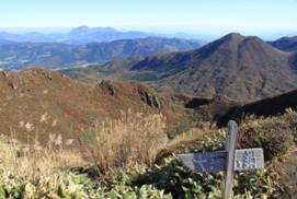 3、三俣山西峰山頂 8時54分 1678m 視界良好。長崎の雲仙普賢岳も見える。