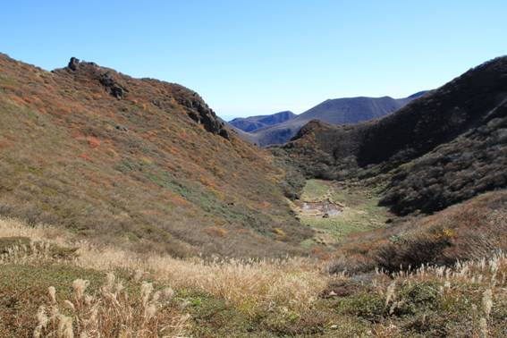 いつもは長者原登山口から三俣山を見上げるが、その逆の景色である。