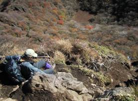 かなりの急勾配 10時02分 本峰の斜面を下って北峰との鞍部に下る。