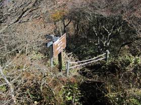 北峰を目指す 9時58分 この本峰で30分程景色を見ながら休憩した。 本峰山頂のすぐ横に、古びた「大鍋。小鍋」への標識があった。どうやらここから下って行く道が北峰に続いているようだ。 他の登山者に一応確認して進んだ。 ところが、ここからが・・・。 |