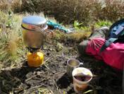坊ヶツルを見下ろし昼食 12時21分 やっと昼食。カップ麺とおにぎり二つ。
