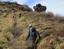 岩の上から北峰を見上げると急勾配を下りてくる登山者が見えた。 11時01分