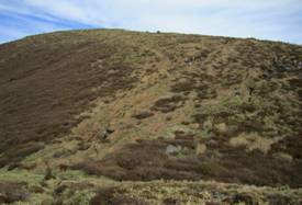 西峰の東肩に到着 8時50分 なだらかな坂道を歩いて山頂へ向かう。ぬかるんだ黒土の道で不覚にも滑ってこけた。