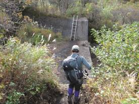 大曲りへの分岐 14時41分 目印の小屋を過ぎて、50m程歩くと左に下る分岐がある。