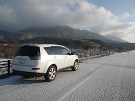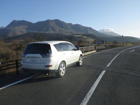 | 「瀬の本高原」から車を走らせ、くじゅう花公園の前を左折、沢水(そうみ)キャンプ場方面に進む。 キャンプ場を左に見て進んで行くとすぐに交差点。その交差点を左に曲がると右斜めに伸びる久住本山(ほんやま)登山道への道が現れる。「なんとお天気がいいのだろう。雲一つないぞ。」 |