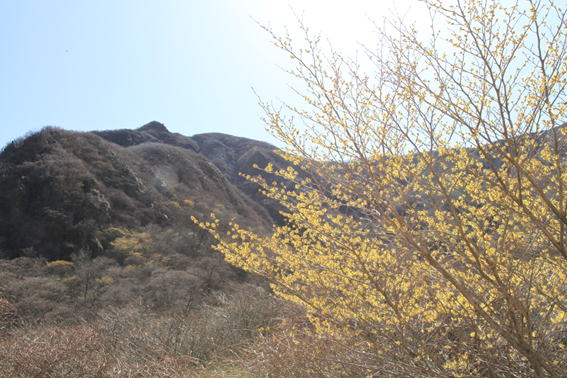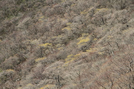 春色の山肌にも黄色いマンサクがあちらこちらに見受けられる。 背景は鳴子山。