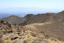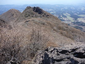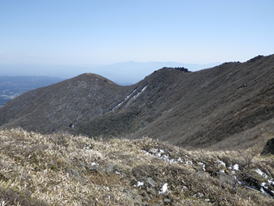 稲星越 左から天狗ヶ城、中岳、三俣山、白口岳 風は強く冷たい 目指す鳴子山は背面
