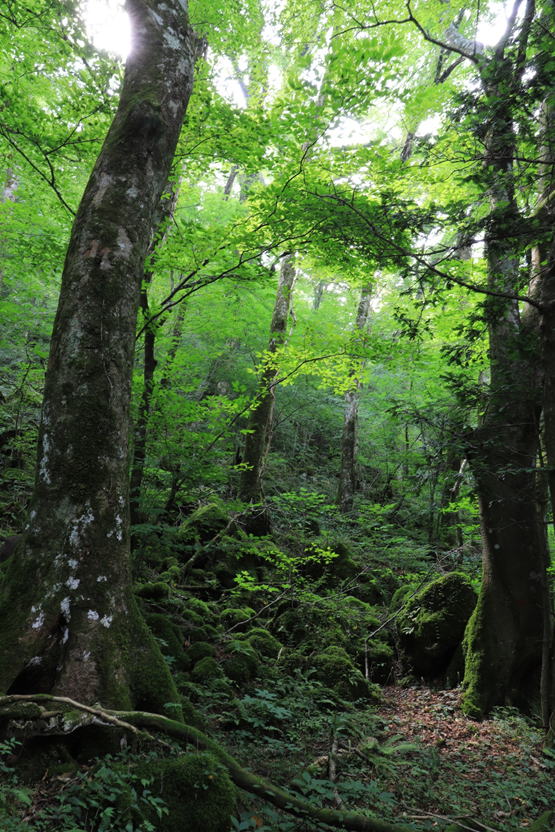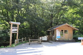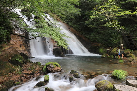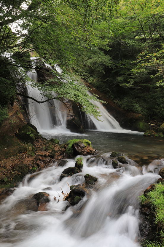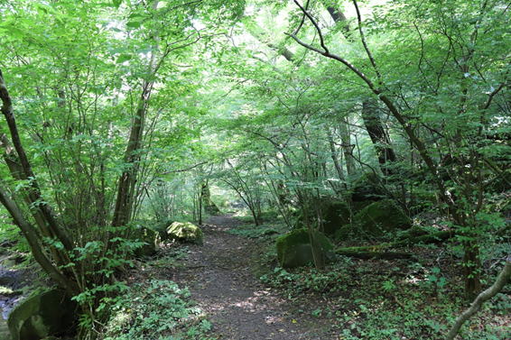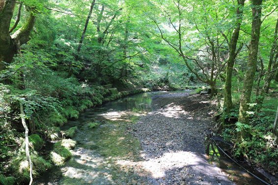 この静かな川の流れが、「名水の滝」では激しい滝へと変わる。 |