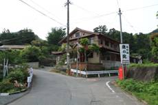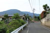 民家の柵に表示があった 6時47分 民家の中を進むと正面に目指す若杉山が見える。予定だとあの頂上まで2時間程。