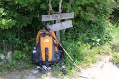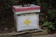 赤い木の橋 15時30分 橋を降りると、登山者による、500回登頂記念の救急箱が設置されていた。