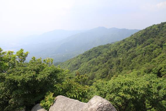 縦走してきた山並みを眺める。左奥に若杉山がかすんで見える。
