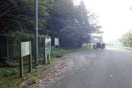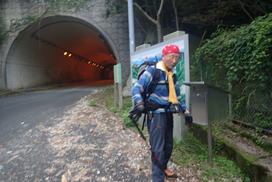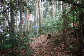 | 我々はこの分岐から右に下って斫石峠(トンネル)の登山口を目指す。 登山口まであと100m下るだけだ。最後まで慎重に! |