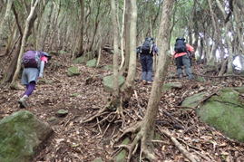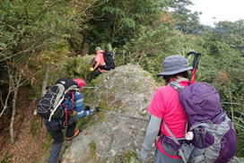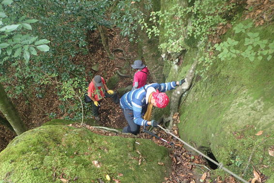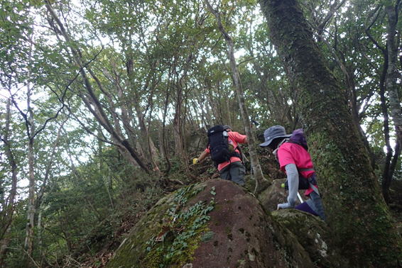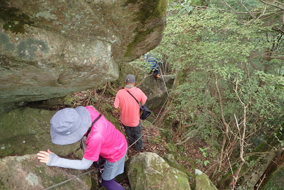 声掛け合って 12時03分 段差の大きい岩場を慎重に下りていく |