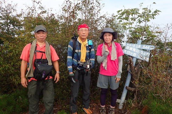 山頂碑の横で記念撮影 9時07分 左からヤジさん、H師匠、T宮さん |