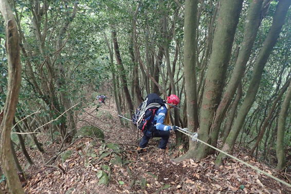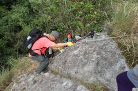 両手でロープを持ち、足場を固めて一歩、一歩 9時45分 この急勾配で滑ると大変だ! |