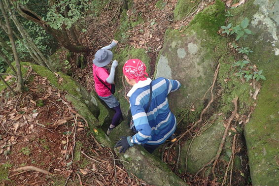 さっそく難所、大岩を潜り抜けて進む 11時29分 峰入古道に圧倒されながら進む |