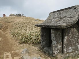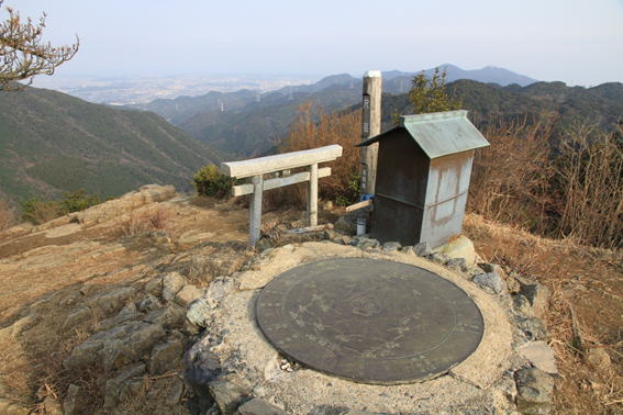 山頂碑右奥の皿倉山方面が北、背面の福智山方面が南となる。 尺岳権現の祠が祀ってある。