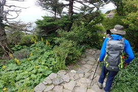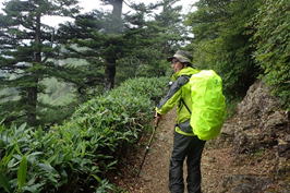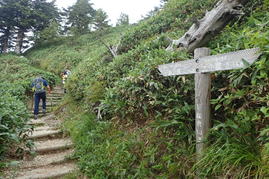 霧に煙る登山道 11時15分 雨は止み上着を脱いだが蒸し暑さは続く |