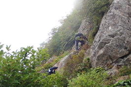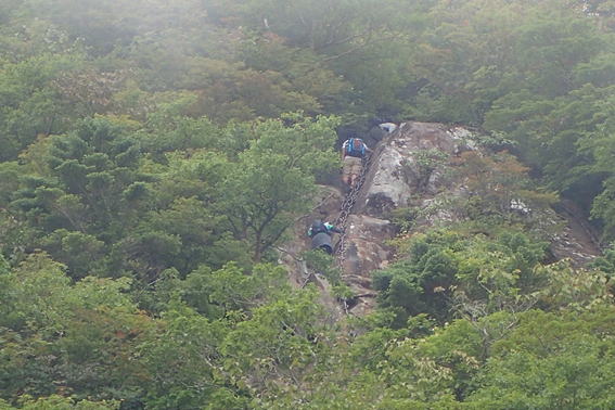そして、このトイレの屋根越しに見上げると・・・二の鎖を上る登山者が見えた |