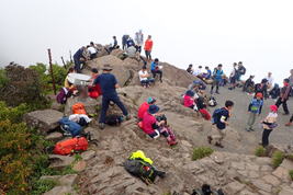 山頂には大勢の登山客 12時44分 おっと、T師匠は登山レディーを写真撮影中。 |