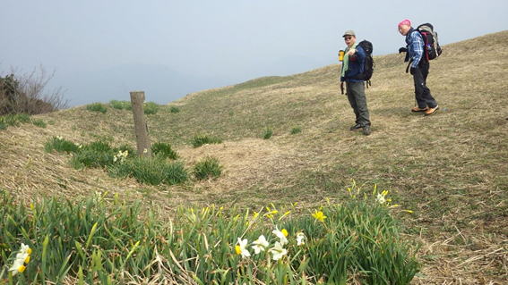 障子ヶ岳山頂 山頂には白や黄色の水仙が咲いていた。