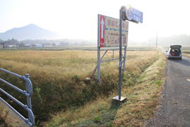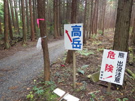 | 久しぶりに山口県の山へ登ることになった。目指す山は高岳山(たかだけやま)。もちろん初めて挑戦する山である。国道9号線にある「長門峡道の駅」の前を通過し、リンゴ園を横目に走ると阿東町の徳佐盆地へと入る。すると次第に右手に岳山の山並みが広がる。今回のメンバーはT師匠とT井夫妻そしてその山友であるH野さんと私の5人である。 林道に入ると・・・「危険! 熊 出没注意」 の看板があり、少々緊張して山に入った。 |