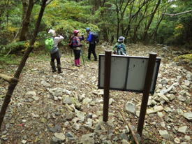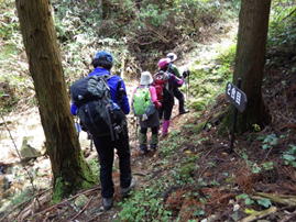 これまでの林道歩きはウォーミングアップ。いよいよ登山口の標識の裏側から取り付く。